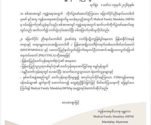 တအာင်းတပ်- TNLA နဲ့ ကိုးကန့်တပ်- MNDAA အကြား ဖြစ်ပွားနေတဲ့ တိုက်ပွဲတွေကို တွေ့ဆုံဆွေးနွေးနည်းနဲ့ အဖြေရှာဖို့ ကျန်းမာရေးမိသားစု (မန္တလေး) က ဒီနေ့ မတ်လ ၁၅ ရက်မှာ ထုတ်ပြန်ချက် ထုတ်ပြီး တိုက်တွန်းထားပါတယ်။