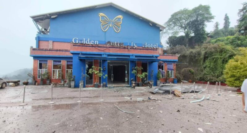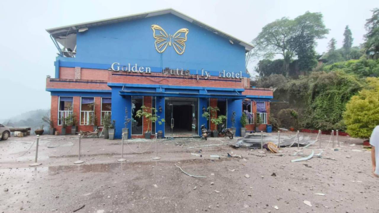ရွှေလိပ်ပြာ ဟိုတယ်ထဲကို စစ်ကောင်စီတပ်က ပေါင် ၅၀၀ ဗုံးနဲ့ ကြဲချတိုက်ခိုက်ခဲ့တာဖြစ်ပြီး အဆောက်အဦးတွေလည်း ထိခိုက်ပျက်စီးခဲ့တယ်လို့ သိရပါတယ်။