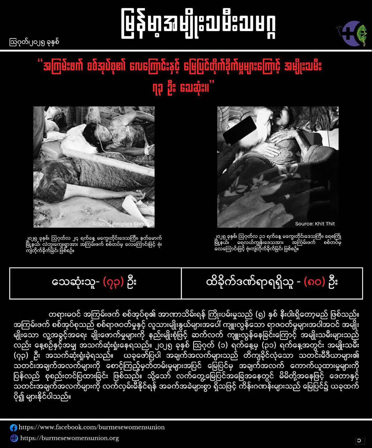 ဒါ့အပြင် ပြီးခဲ့တဲ့ မေလ တစ်လအတွင်းမှာလည်း စစ်ကောင်စီတပ်ရဲ့ လေကြောင်း တိုက်ခိုက်မှုနဲ့ လက်နက်ကြီး ပစ်ခတ်မှုကြောင့် အမျိုးသမီး ၉၂ ဦး သေဆုံးခဲ့ပါတယ်။