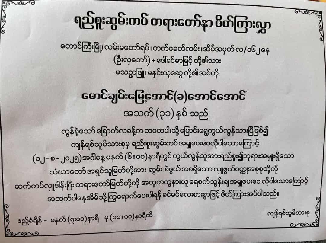 အဆိုပါ သေဆုံးမှုအကြောင်းကိုလည်း တောင်ကြီးမြို့ ရပ်ကွက်အုပ်ချုပ်ရေးမှူးကနေတစ်ဆင့် မိသားစုထံ ပြီးခဲ့တဲ့ ရက်ပိုင်းအတွင်း အကြောင်းကြားလာတာ ဖြစ်ပြီး မနေ့၊ သြဂုတ်လ ၁၂ ရက်မှာတော့ ၎င်းရဲ့ နာရေးကို ပြုလုပ်ခဲ့တယ်လို့ ဆိုပါတယ်။