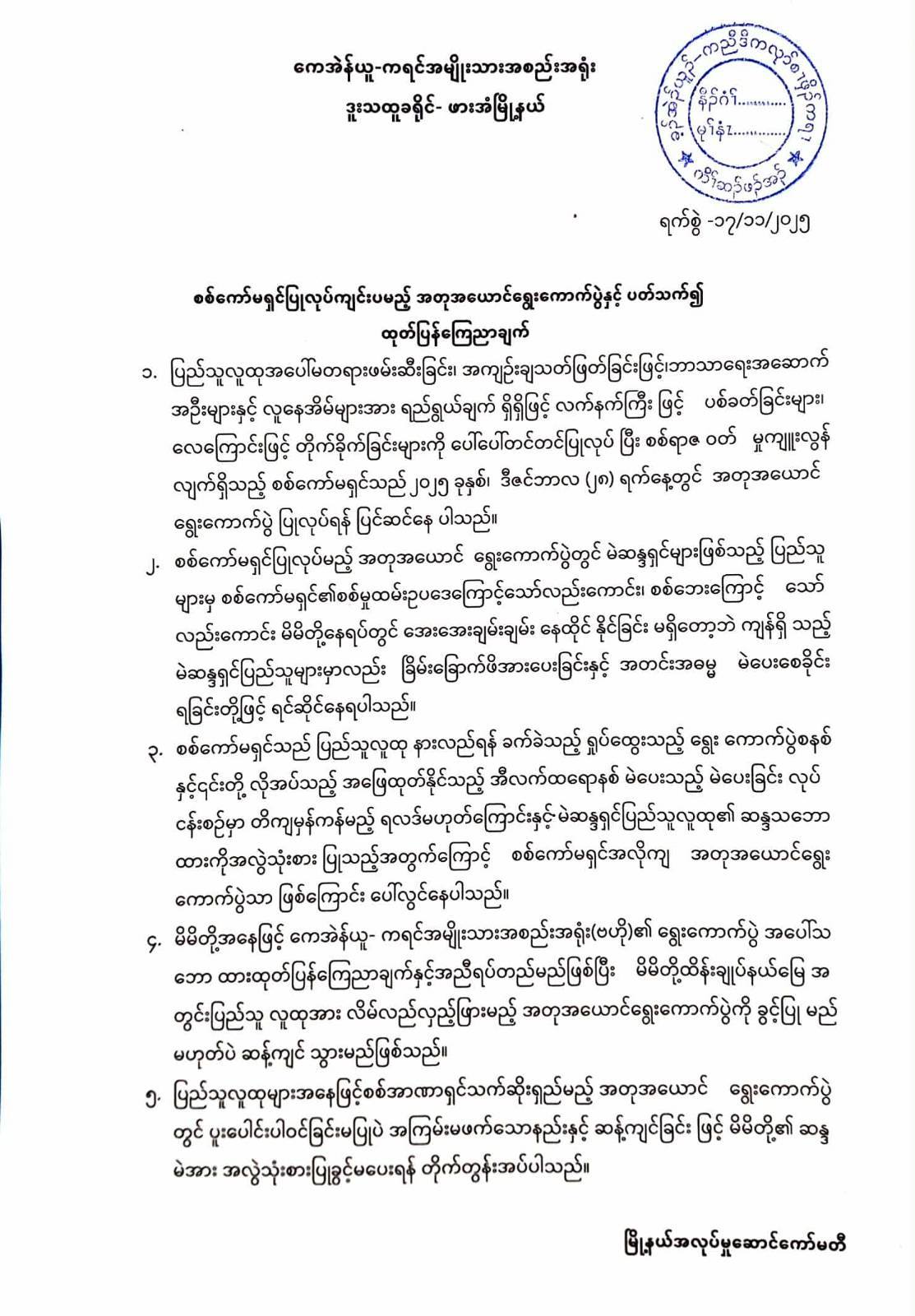 ကရင်အမျိုးသားအစည်းအရုံး KNU ရဲ့ ထိန်းချုပ်နယ်မြေဖြစ်တဲ့ ဒူးသထူခရိုင် ဖားအံမြို့နယ် လူထုတွေအနေနဲ့ စစ်ကောင်စီပြုလုပ်မဲ့ အတုအယောင်ရွေးကောက်ပွဲကို မပူးပေါင်းကြဖို့နဲ့ အကြမ်းမဖက်တဲ့နည်းနဲ့ ဆန့်ကျင်ကြဖို့ မနေ့ နိုဝင်ဘာ ၁၇ ရက် ရက်စွဲနဲ့ တိုက်တွန်းထုတ်ပြန်ထားပါတယ်။