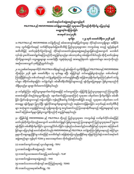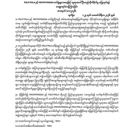 TNLA နဲ့ MNDAA နှစ်ဖွဲ့လုံးဟာ ပြည်သူလူထုကိုကာကွယ်ဖို့ လက်နက်ကိုင်လမ်းစဥ်နဲ့ တော်လှန်တိုက်ပွဲဝင်ခဲ့ကြတဲ့အလျောက် မဟာမိတ်အချင်းချင်းကြားဖြစ်ပွားတဲ့ ပြဿနာတွေကိုလည်း လူထုတွေအပေါ် ပုံမချပဲ နှစ်ဖက်တပ်အကြား ဆွေးနွေးညှိနှိုင်းမှုလမ်းစဥ်နဲ့ မဟာမိတ်အချင်းချင်း အမြန်ဆုံးပြေလည်မှုရအောင် ဖြေရှင်းကြဖို့ကိုလည်း အာင်းအရပ်ဖက်အဖွဲ့အစည်းများကွန်ရက်က တောင်းဆိုထားပါတယ်။