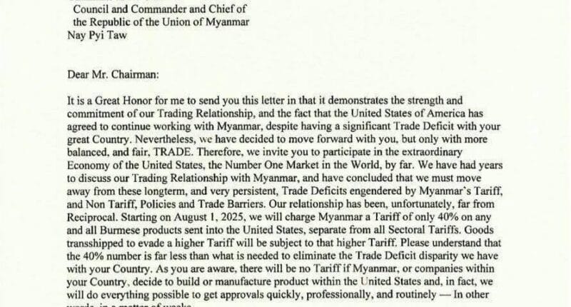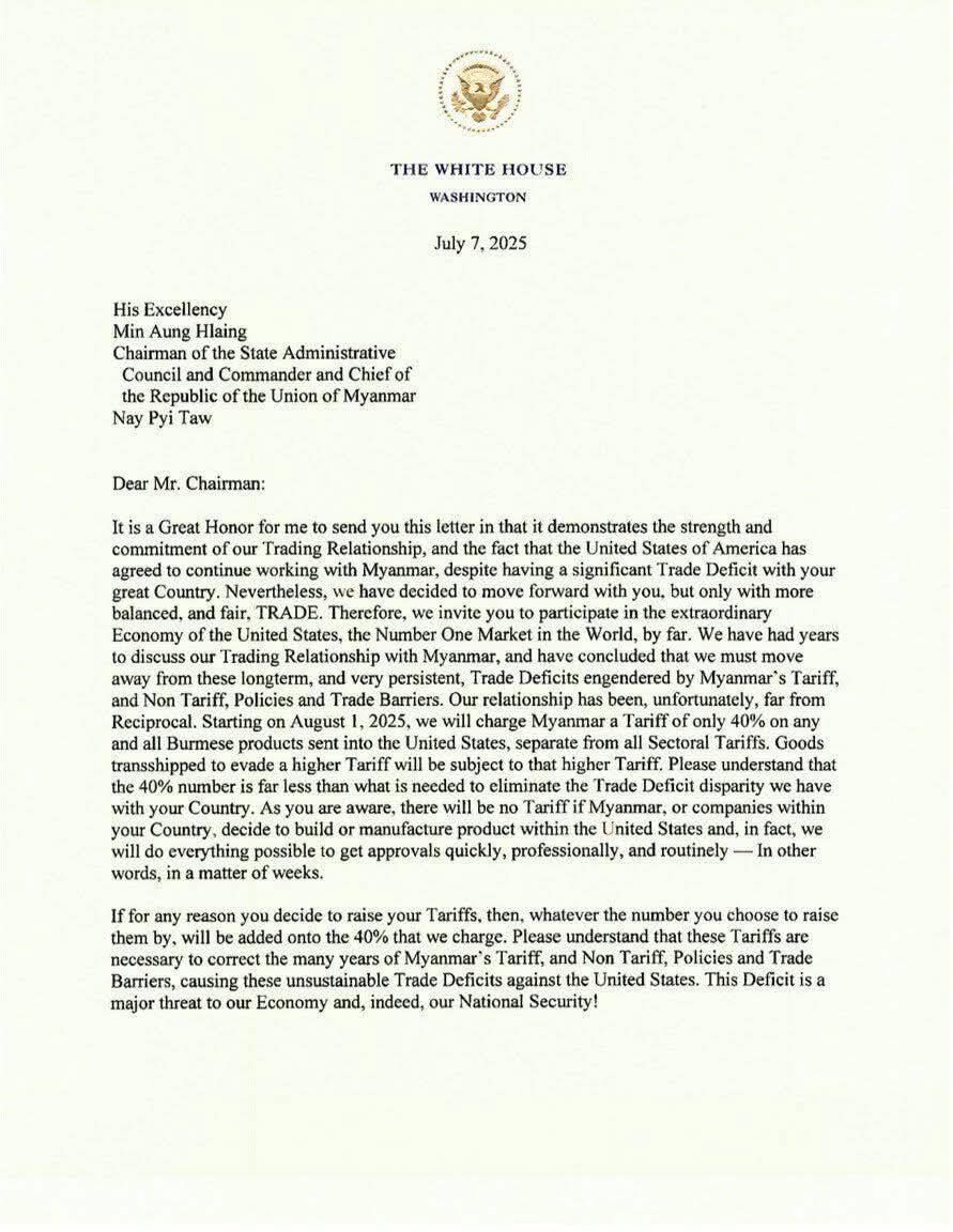 အမေရိကန်သမ္မတ ဒေါ်နယ်ထရမ့်က ၂၀၂၅ ခုနှစ် ဇူလိုင် ၇ ရက်နေ့မှာ မြန်မာနိုင်ငံ၊ ထိုင်းနိုင်ငံ၊ လာအိုနိုင်ငံ၊ ဂျပန်နိုင်ငံ၊ တောင်ကိုရီးယားနိုင်ငံ၊ အင်ဒိုနီးရှားနိုင်ငံအပါအဝင် နိုင်ငံ (၁၄) နိုင်ငံမှ ကုန်စည်တွေအပေါ် အခွန်တိုးမြှင့်မယ့် အကြောင်းကြားစာ ပေးထားခဲ့ပါတယ်။