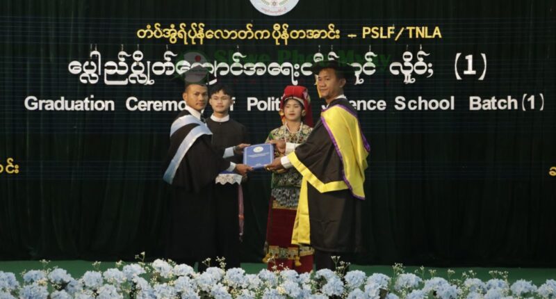 တအာင်းပြည်နယ်လွတ်မြောက်ရေးတပ်ဦး- PSLF/TNLA ဦးဆောင်ဖွင့်လှစ်ထားတဲ့ နိုင်ငံရေးသိပ္ပံကျောင်း- PSS ရဲ့ ကျောင်းဆင်းပွဲနဲ့ ဒီပလိုမာဘွဲ့ အပ်နှံခြင်းအခမ်းအနားကို တအာင်းဒေသတစ်နေရာမှာ ကျင်းပပြီးစီးခဲ့ပါတယ်။