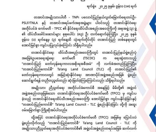 တအာင်းပြည်ကောင်စီ- TLC ကို တအာင်းပြည်ရဲ့ အမြင့်ဆုံးအာဏာပိုင်အဖွဲ့အစည်းအဖြစ် ဖွဲ့စည်းလိုက်တဲ့အပေါ် အမျိုးသားညီညွတ်ရေး အတိုင်ပင်ခံကောင်စီ- NUCC က မနေ့ ဇွန်လ ၁၈ ရက်မှာ ဂုဏ်ပြုသဝဏ်လွှာပေးပို့ခဲ့ပါတယ်။